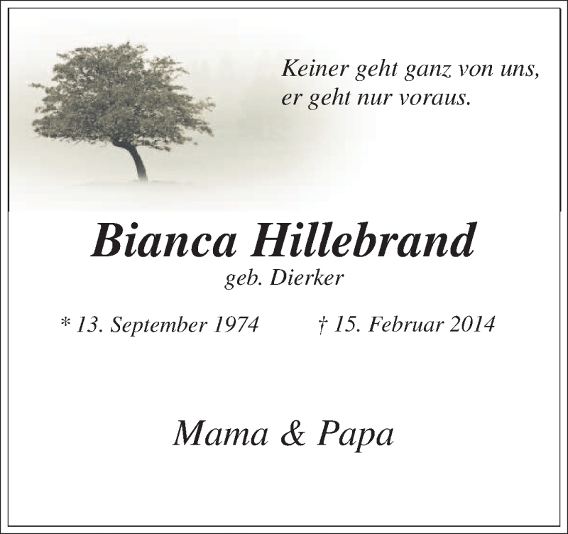 Hier finden Sie alle Traueranzeigen aus der Zeitung, die bisher für Bianca Hillebrand erschienen sind. Weitere Traueranzeigen, die in der Zeitung erscheinen, werden hier ebenfalls aufgelistet