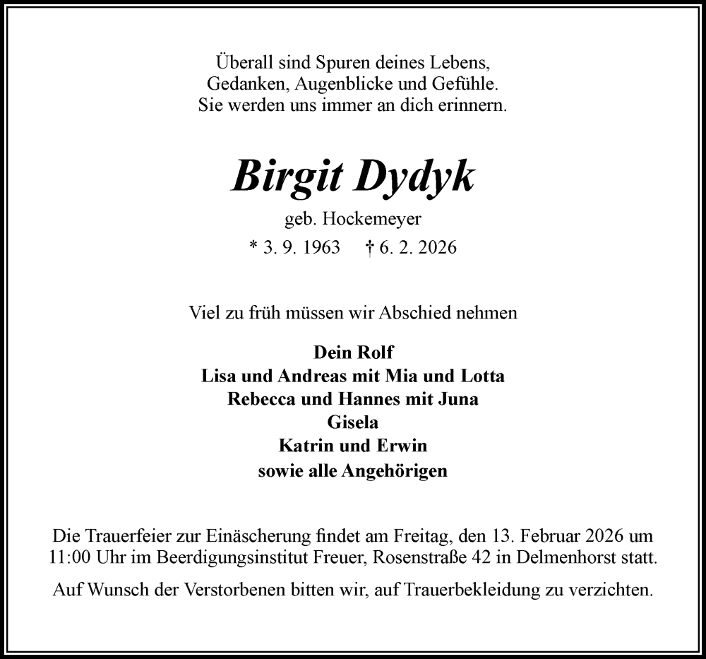 Hier finden Sie alle Traueranzeigen aus der Zeitung, die bisher für Birgit Dydyk erschienen sind. Weitere Traueranzeigen, die in der Zeitung erscheinen, werden hier ebenfalls aufgelistet