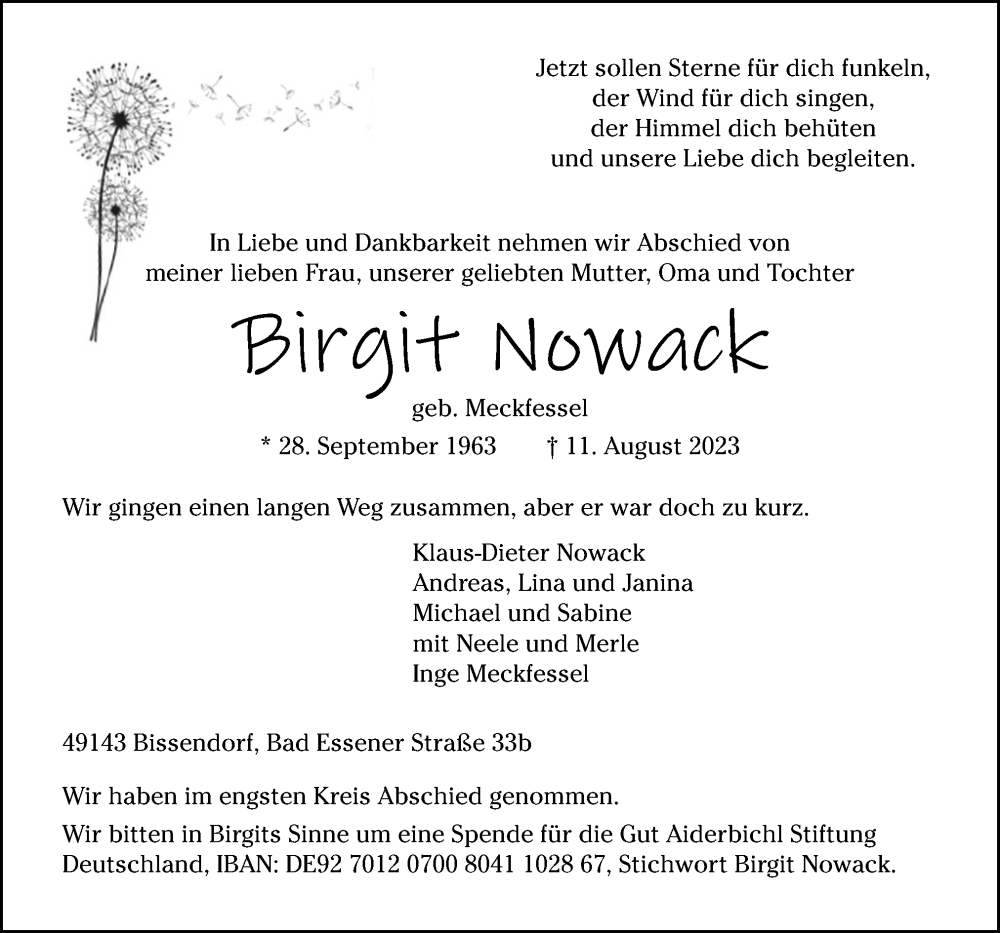 Hier finden Sie alle Traueranzeigen aus der Zeitung, die bisher für Birgit Nowack erschienen sind. Weitere Traueranzeigen, die in der Zeitung erscheinen, werden hier ebenfalls aufgelistet