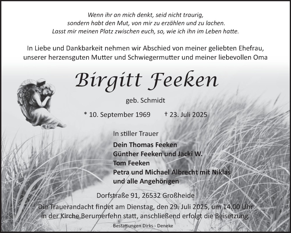 Hier finden Sie alle Traueranzeigen aus der Zeitung, die bisher für Birgitt Feeken erschienen sind. Weitere Traueranzeigen, die in der Zeitung erscheinen, werden hier ebenfalls aufgelistet