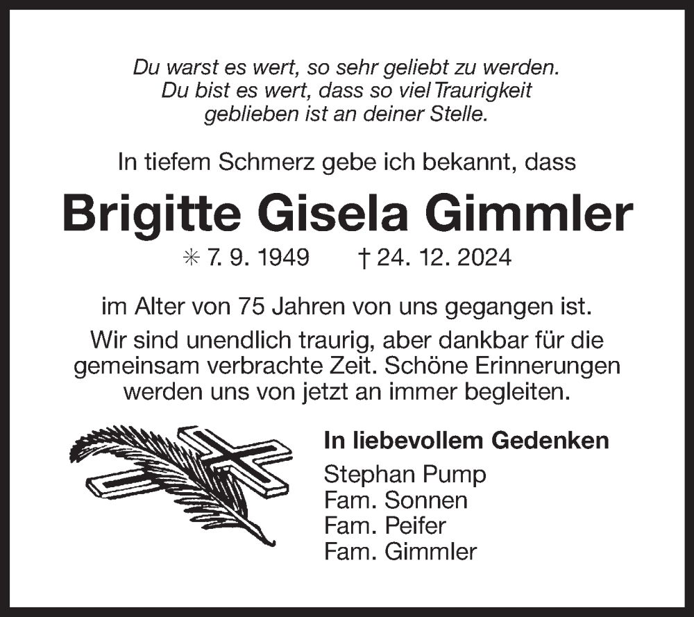 Hier finden Sie alle Traueranzeigen aus der Zeitung, die bisher für Brigitte Gisela Gimmler erschienen sind. Weitere Traueranzeigen, die in der Zeitung erscheinen, werden hier ebenfalls aufgelistet