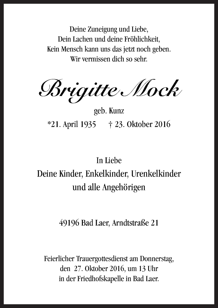 Hier finden Sie alle Traueranzeigen aus der Zeitung, die bisher für Brigitte Mock erschienen sind. Weitere Traueranzeigen, die in der Zeitung erscheinen, werden hier ebenfalls aufgelistet