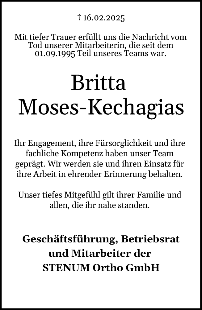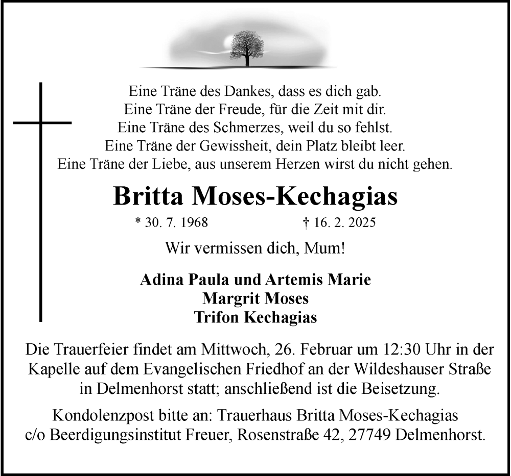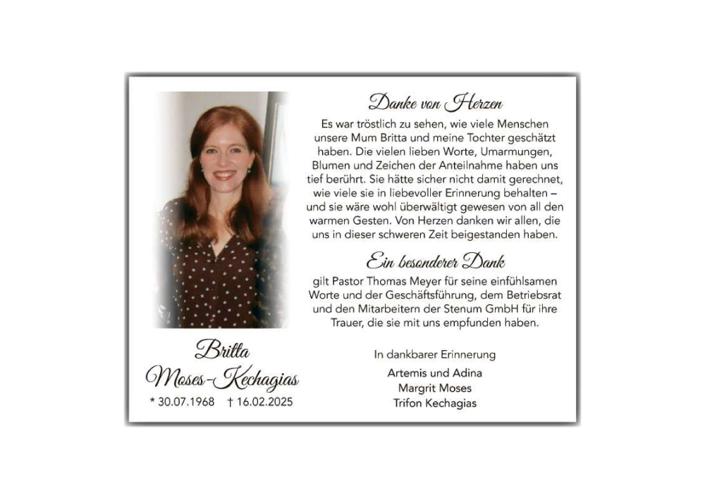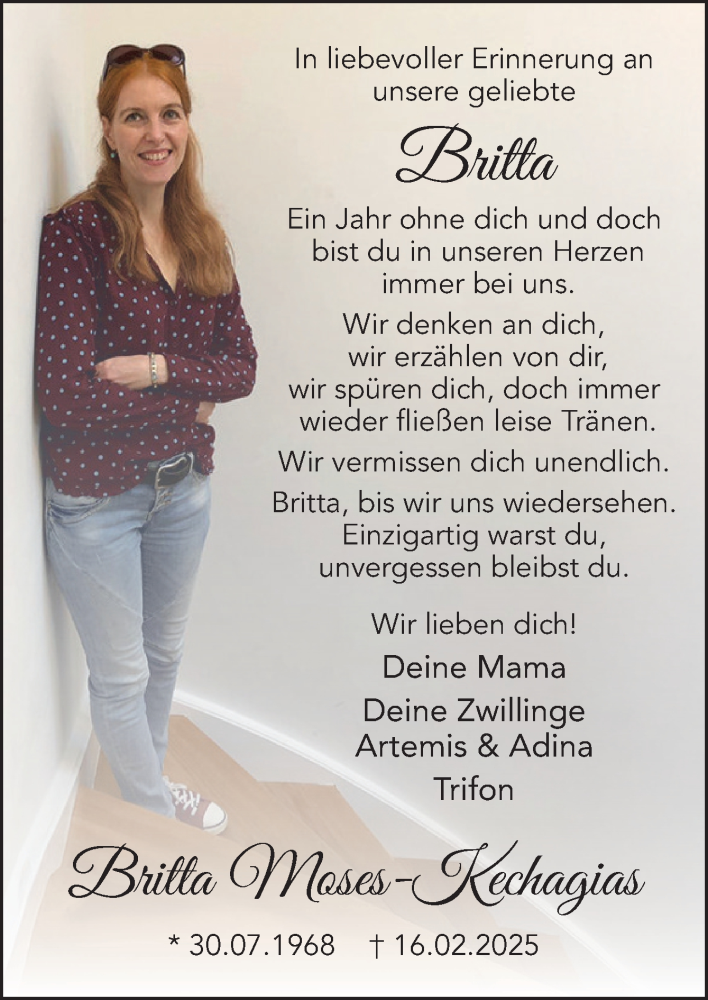 Hier finden Sie alle Traueranzeigen aus der Zeitung, die bisher für Britta Moses-Kechagias erschienen sind. Weitere Traueranzeigen, die in der Zeitung erscheinen, werden hier ebenfalls aufgelistet