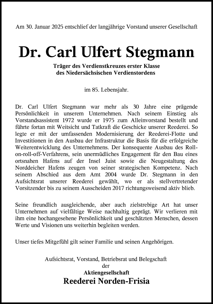 Hier finden Sie alle Traueranzeigen aus der Zeitung, die bisher für Carl Ulfert Stegmann erschienen sind. Weitere Traueranzeigen, die in der Zeitung erscheinen, werden hier ebenfalls aufgelistet