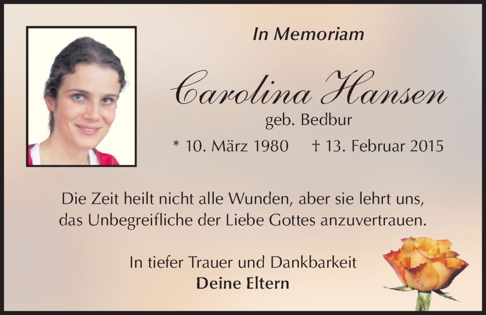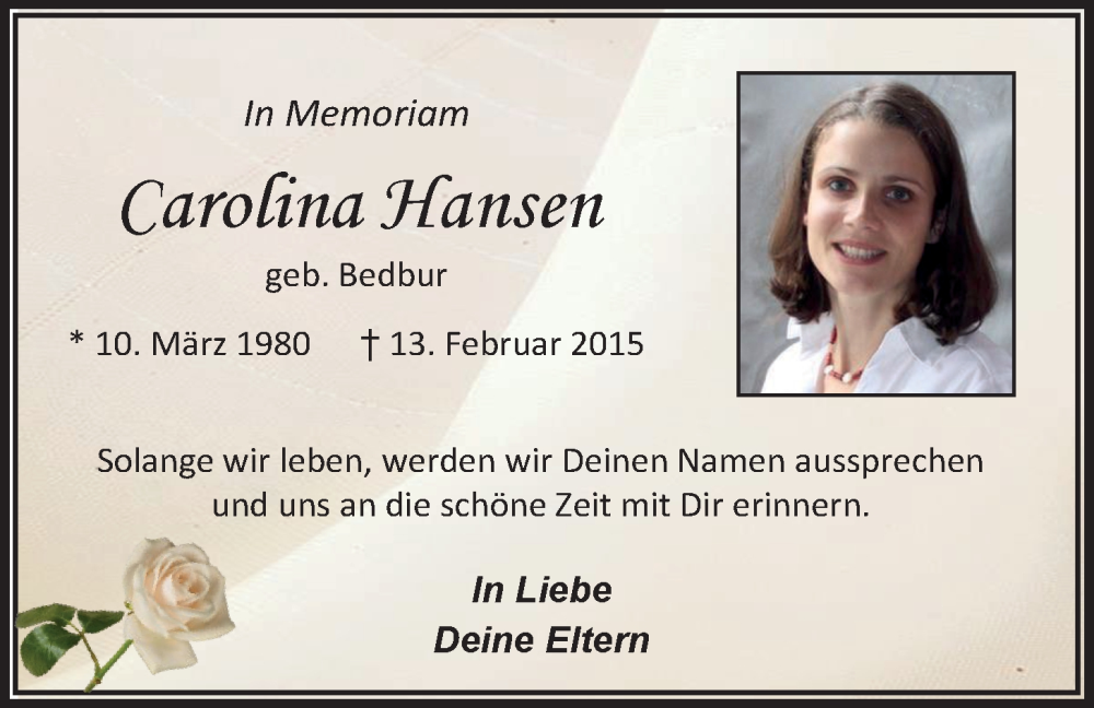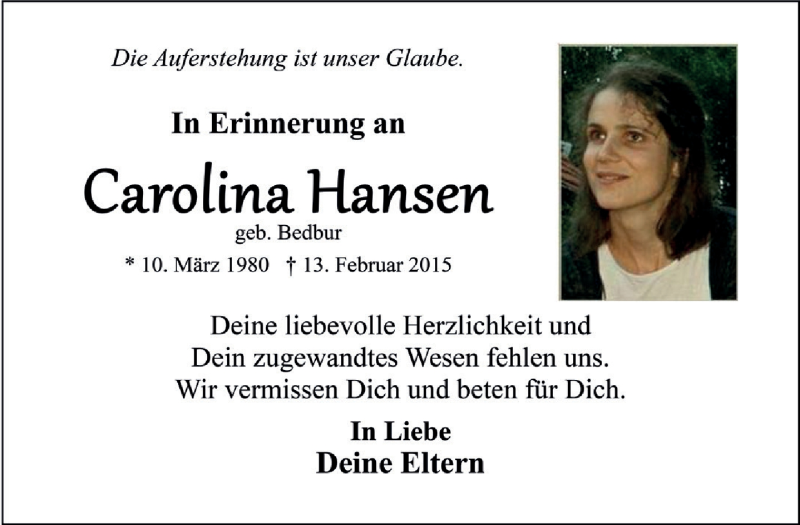 Hier finden Sie alle Traueranzeigen aus der Zeitung, die bisher für Carolina Hansen erschienen sind. Weitere Traueranzeigen, die in der Zeitung erscheinen, werden hier ebenfalls aufgelistet