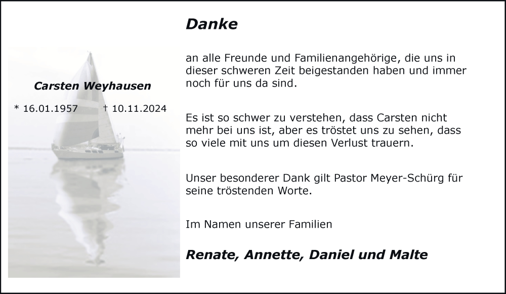 Hier finden Sie alle Traueranzeigen aus der Zeitung, die bisher für Carsten Weyhausen erschienen sind. Weitere Traueranzeigen, die in der Zeitung erscheinen, werden hier ebenfalls aufgelistet