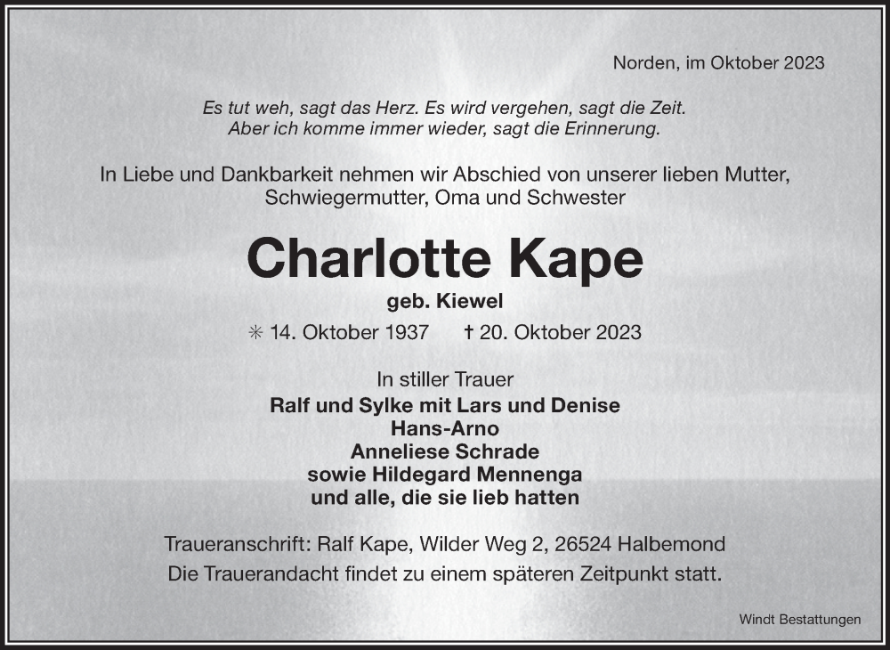 Hier finden Sie alle Traueranzeigen aus der Zeitung, die bisher für Charlotte Kape erschienen sind. Weitere Traueranzeigen, die in der Zeitung erscheinen, werden hier ebenfalls aufgelistet