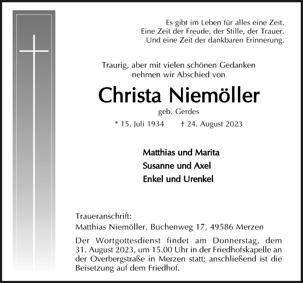 Hier finden Sie alle Traueranzeigen aus der Zeitung, die bisher für Christa Niemöller erschienen sind. Weitere Traueranzeigen, die in der Zeitung erscheinen, werden hier ebenfalls aufgelistet