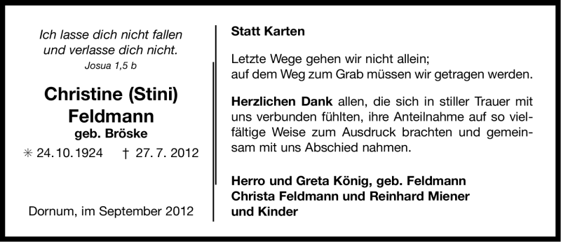 Hier finden Sie alle Traueranzeigen aus der Zeitung, die bisher für Christine Feldmann erschienen sind. Weitere Traueranzeigen, die in der Zeitung erscheinen, werden hier ebenfalls aufgelistet