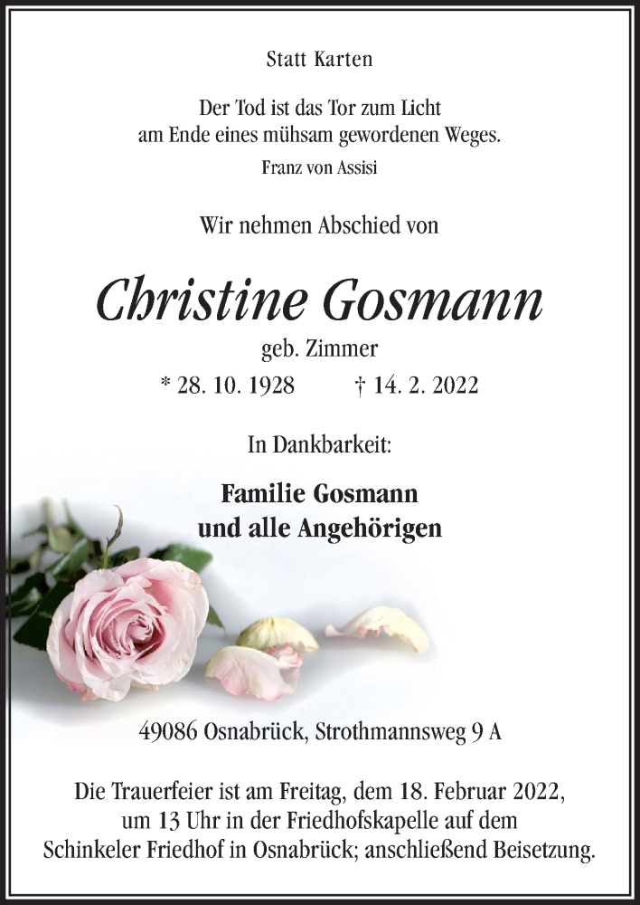 Hier finden Sie alle Traueranzeigen aus der Zeitung, die bisher für Christine Gosmann erschienen sind. Weitere Traueranzeigen, die in der Zeitung erscheinen, werden hier ebenfalls aufgelistet