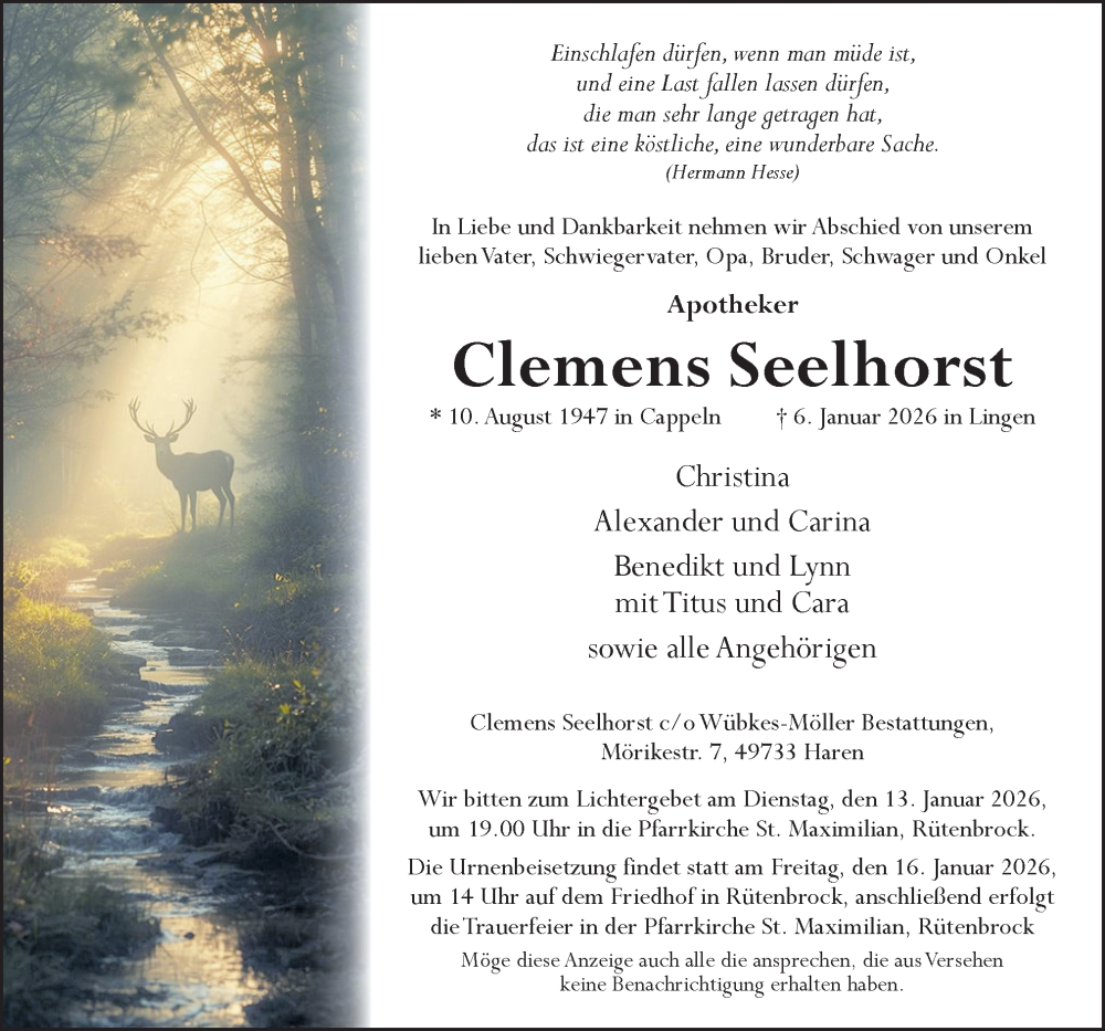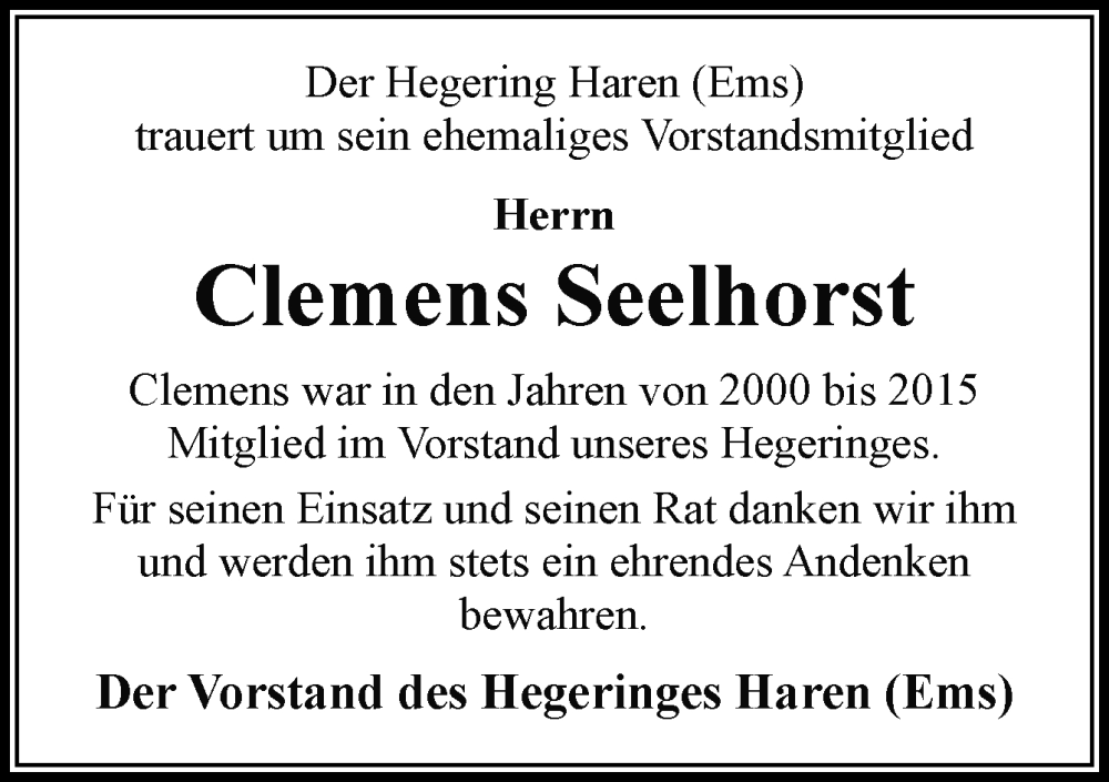Hier finden Sie alle Traueranzeigen aus der Zeitung, die bisher für Clemens Seelhorst erschienen sind. Weitere Traueranzeigen, die in der Zeitung erscheinen, werden hier ebenfalls aufgelistet