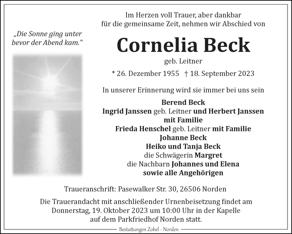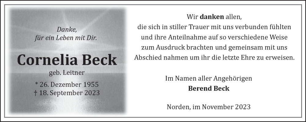 Hier finden Sie alle Traueranzeigen aus der Zeitung, die bisher für Cornelia Beck erschienen sind. Weitere Traueranzeigen, die in der Zeitung erscheinen, werden hier ebenfalls aufgelistet