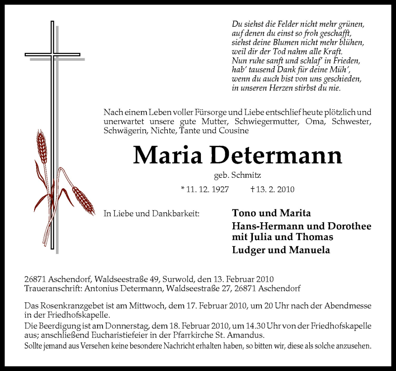Hier finden Sie alle Traueranzeigen aus der Zeitung, die bisher für Maria Determann erschienen sind. Weitere Traueranzeigen, die in der Zeitung erscheinen, werden hier ebenfalls aufgelistet