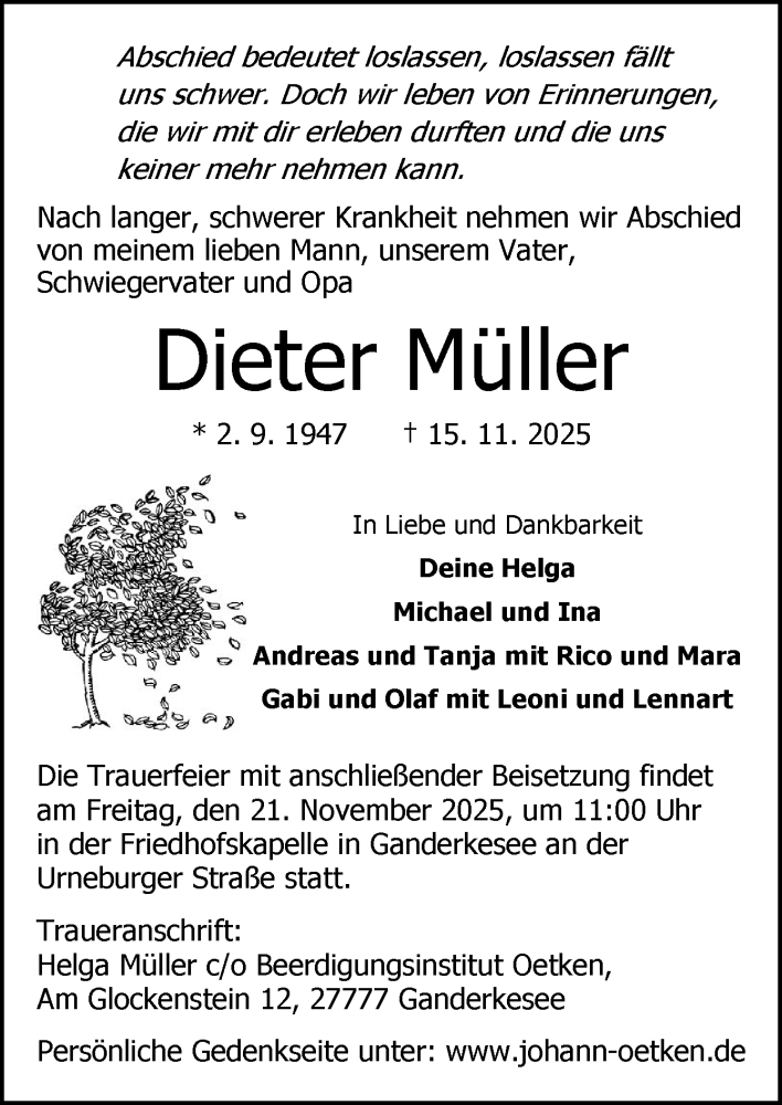 Hier finden Sie alle Traueranzeigen aus der Zeitung, die bisher für Dieter Müller erschienen sind. Weitere Traueranzeigen, die in der Zeitung erscheinen, werden hier ebenfalls aufgelistet