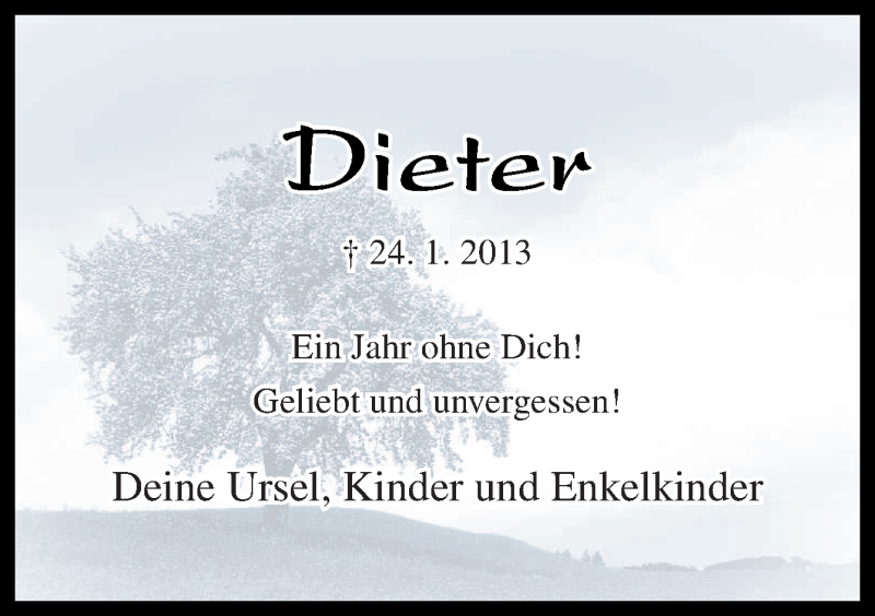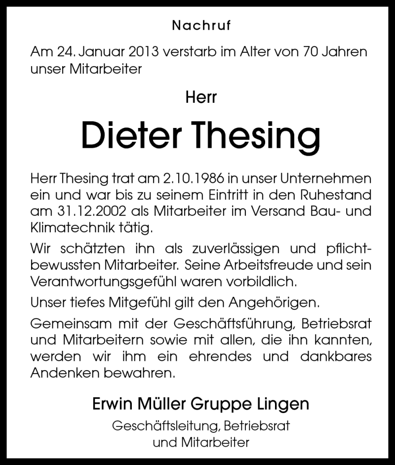 Hier finden Sie alle Traueranzeigen aus der Zeitung, die bisher für Dieter Thesing erschienen sind. Weitere Traueranzeigen, die in der Zeitung erscheinen, werden hier ebenfalls aufgelistet
