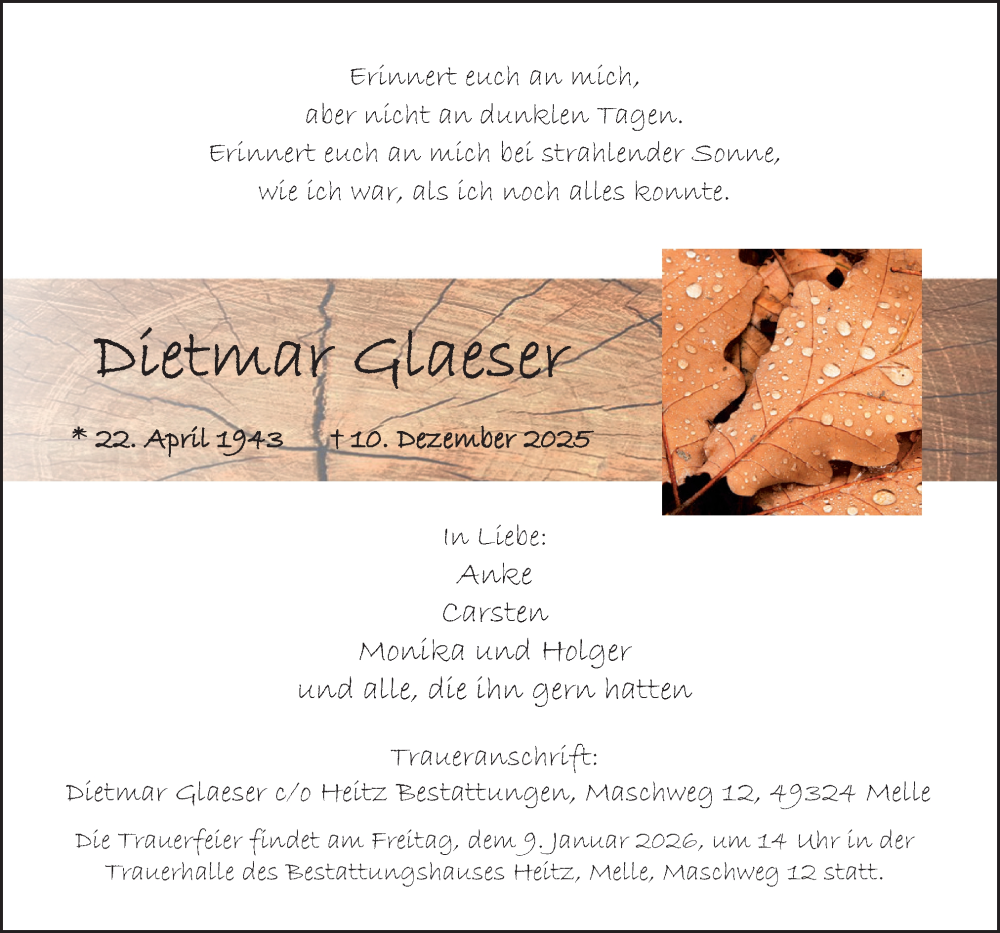 Hier finden Sie alle Traueranzeigen aus der Zeitung, die bisher für Dietmar Glaeser erschienen sind. Weitere Traueranzeigen, die in der Zeitung erscheinen, werden hier ebenfalls aufgelistet