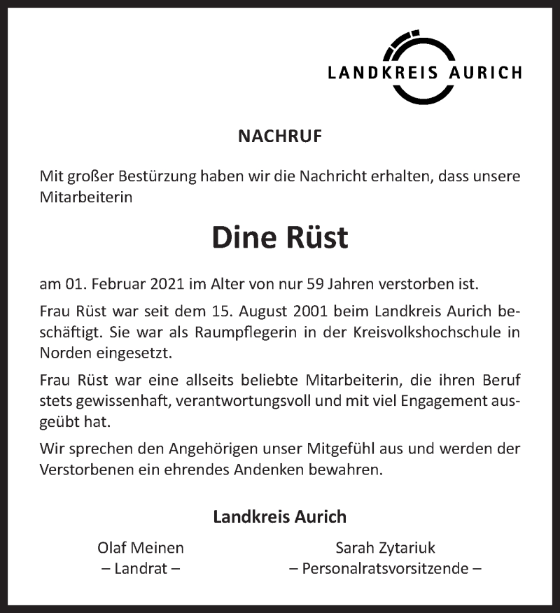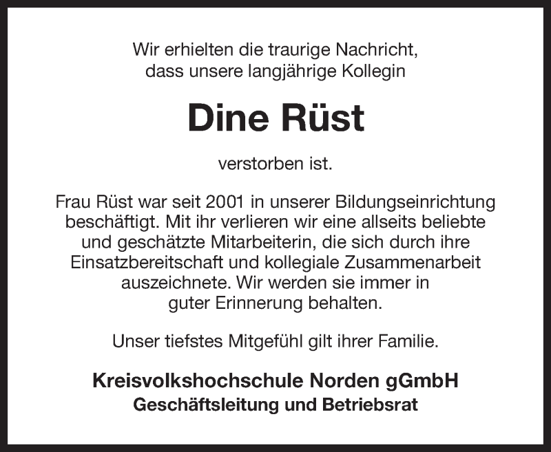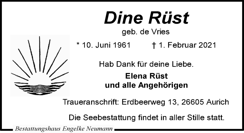Hier finden Sie alle Traueranzeigen aus der Zeitung, die bisher für Dine Rüst erschienen sind. Weitere Traueranzeigen, die in der Zeitung erscheinen, werden hier ebenfalls aufgelistet