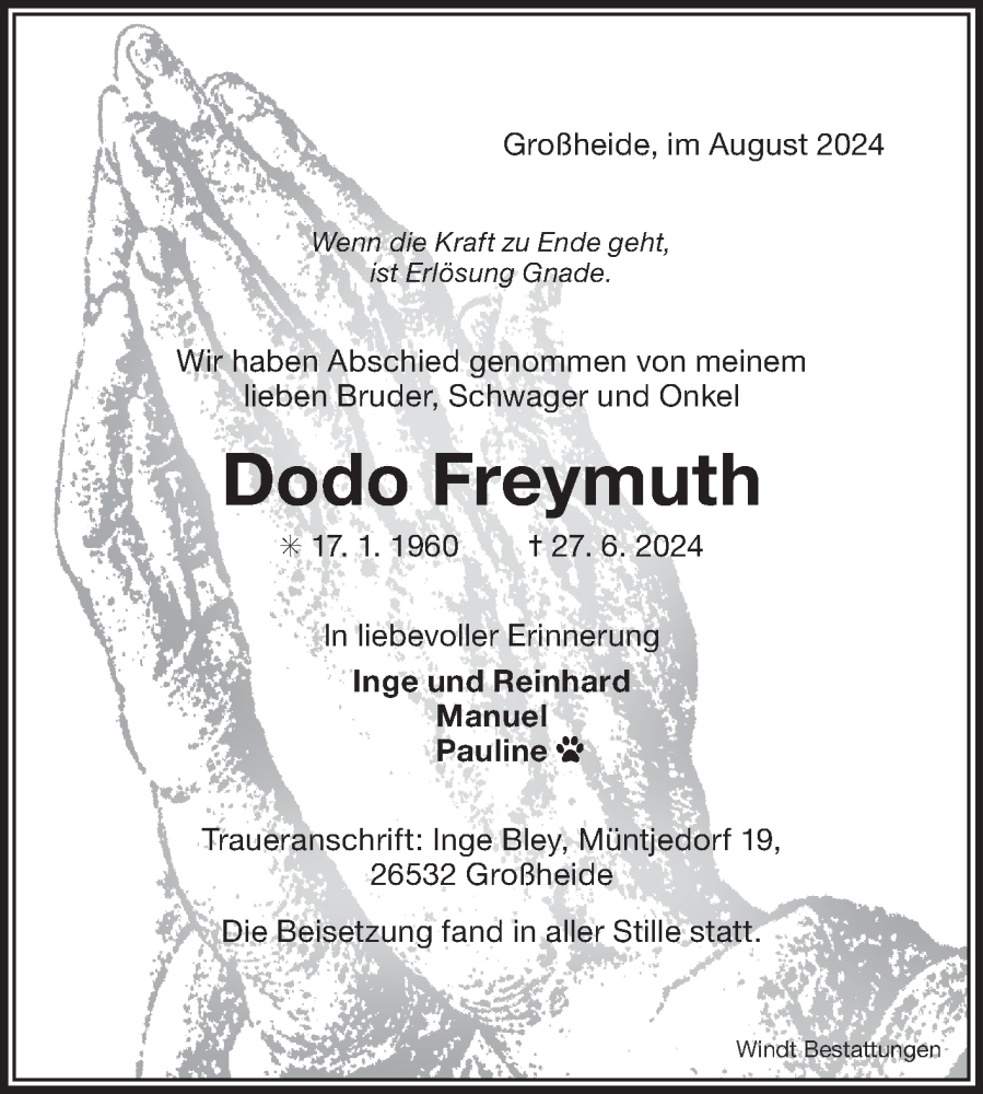Hier finden Sie alle Traueranzeigen aus der Zeitung, die bisher für Dodo Freymuth erschienen sind. Weitere Traueranzeigen, die in der Zeitung erscheinen, werden hier ebenfalls aufgelistet