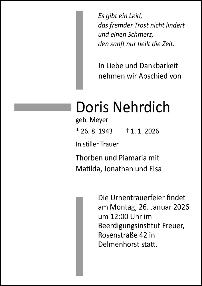 Hier finden Sie alle Traueranzeigen aus der Zeitung, die bisher für Doris Nehrdich erschienen sind. Weitere Traueranzeigen, die in der Zeitung erscheinen, werden hier ebenfalls aufgelistet