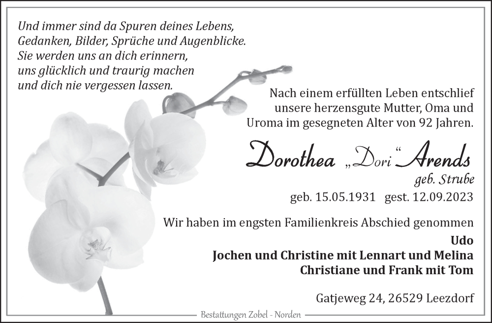 Hier finden Sie alle Traueranzeigen aus der Zeitung, die bisher für Dorothea Arends erschienen sind. Weitere Traueranzeigen, die in der Zeitung erscheinen, werden hier ebenfalls aufgelistet