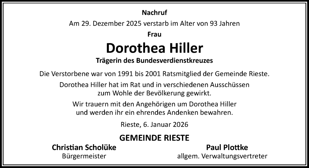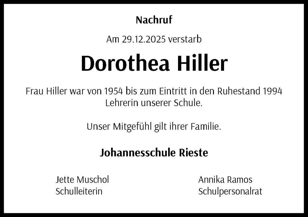 Hier finden Sie alle Traueranzeigen aus der Zeitung, die bisher für Dorothea Hiller erschienen sind. Weitere Traueranzeigen, die in der Zeitung erscheinen, werden hier ebenfalls aufgelistet