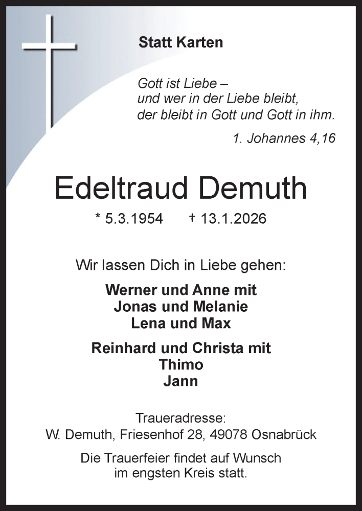 Hier finden Sie alle Traueranzeigen aus der Zeitung, die bisher für Edeltraud Demuth erschienen sind. Weitere Traueranzeigen, die in der Zeitung erscheinen, werden hier ebenfalls aufgelistet