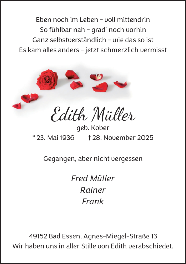 Hier finden Sie alle Traueranzeigen aus der Zeitung, die bisher für Edith Müller erschienen sind. Weitere Traueranzeigen, die in der Zeitung erscheinen, werden hier ebenfalls aufgelistet