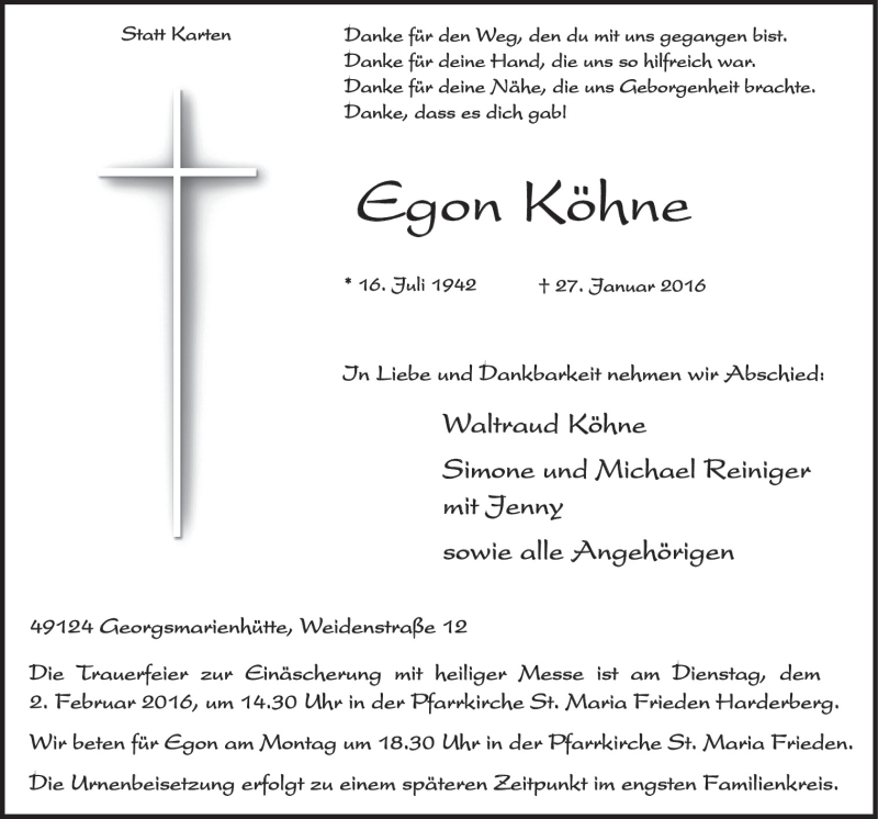 Hier finden Sie alle Traueranzeigen aus der Zeitung, die bisher für Egon Köhne erschienen sind. Weitere Traueranzeigen, die in der Zeitung erscheinen, werden hier ebenfalls aufgelistet