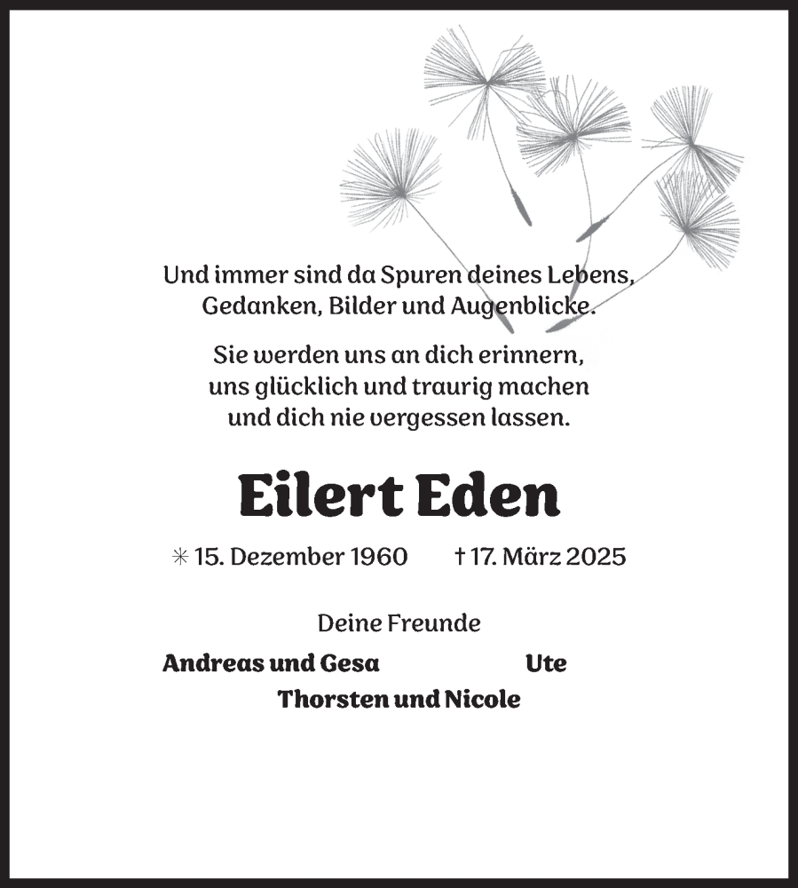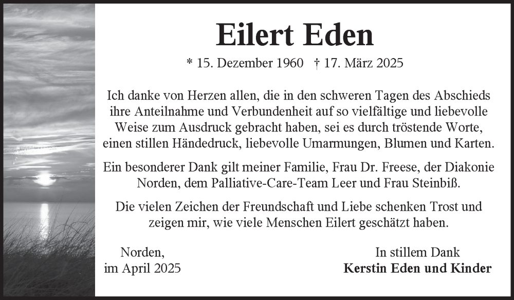 Hier finden Sie alle Traueranzeigen aus der Zeitung, die bisher für Eilert Eden erschienen sind. Weitere Traueranzeigen, die in der Zeitung erscheinen, werden hier ebenfalls aufgelistet