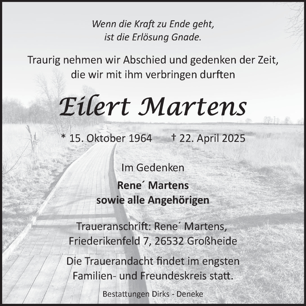 Hier finden Sie alle Traueranzeigen aus der Zeitung, die bisher für Eilert Martens erschienen sind. Weitere Traueranzeigen, die in der Zeitung erscheinen, werden hier ebenfalls aufgelistet