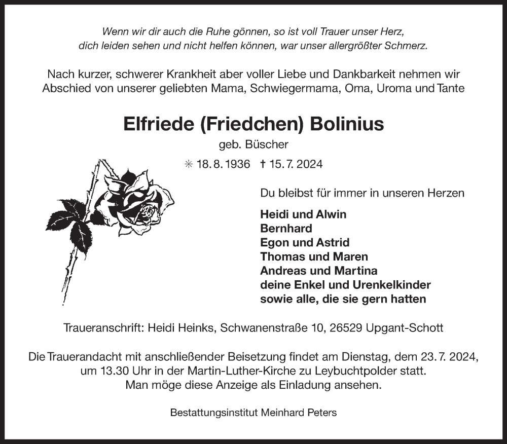 Hier finden Sie alle Traueranzeigen aus der Zeitung, die bisher für Elfriede Bolinius erschienen sind. Weitere Traueranzeigen, die in der Zeitung erscheinen, werden hier ebenfalls aufgelistet