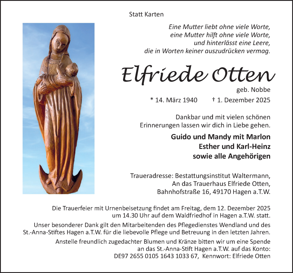 Hier finden Sie alle Traueranzeigen aus der Zeitung, die bisher für Elfriede Otten erschienen sind. Weitere Traueranzeigen, die in der Zeitung erscheinen, werden hier ebenfalls aufgelistet