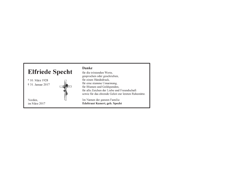 Hier finden Sie alle Traueranzeigen aus der Zeitung, die bisher für Elfriede Specht erschienen sind. Weitere Traueranzeigen, die in der Zeitung erscheinen, werden hier ebenfalls aufgelistet