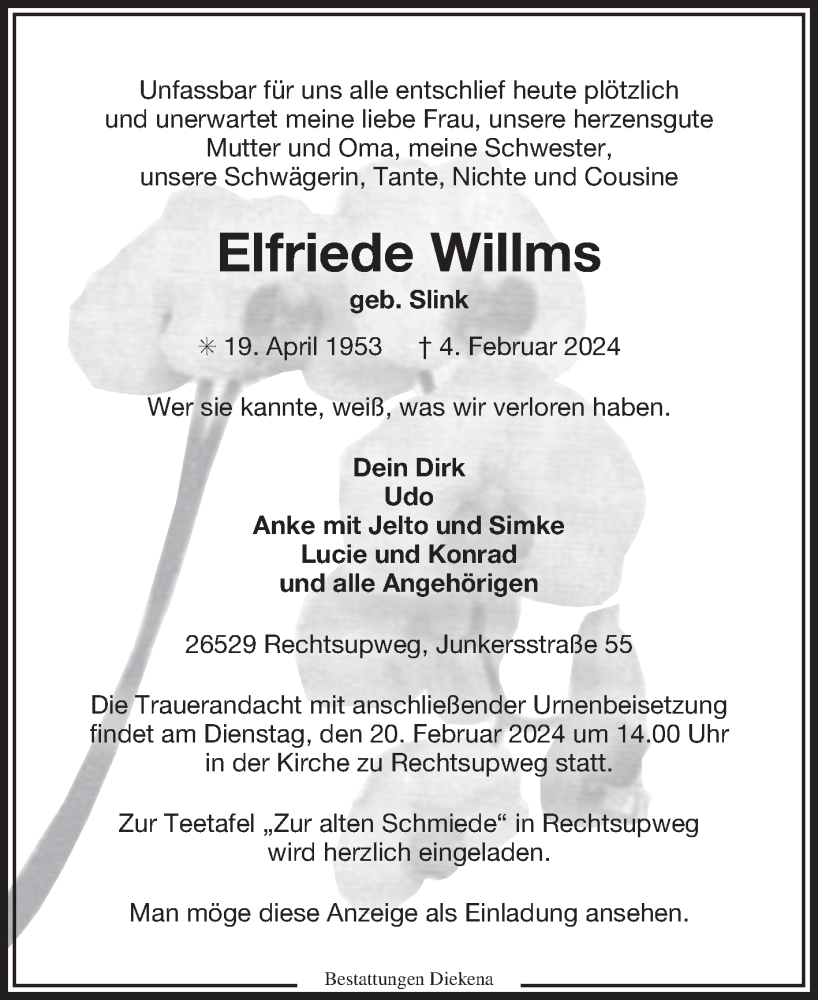 Hier finden Sie alle Traueranzeigen aus der Zeitung, die bisher für Elfriede Willms erschienen sind. Weitere Traueranzeigen, die in der Zeitung erscheinen, werden hier ebenfalls aufgelistet