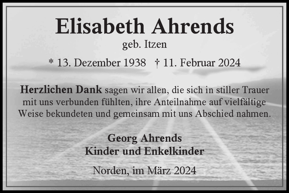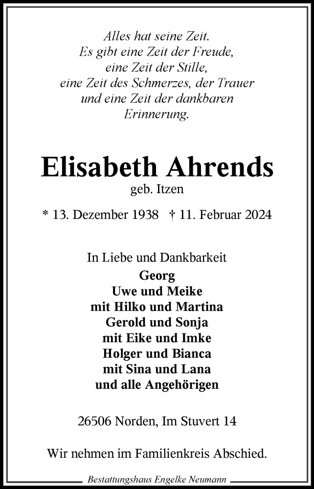 Hier finden Sie alle Traueranzeigen aus der Zeitung, die bisher für Elisabeth Ahrends erschienen sind. Weitere Traueranzeigen, die in der Zeitung erscheinen, werden hier ebenfalls aufgelistet