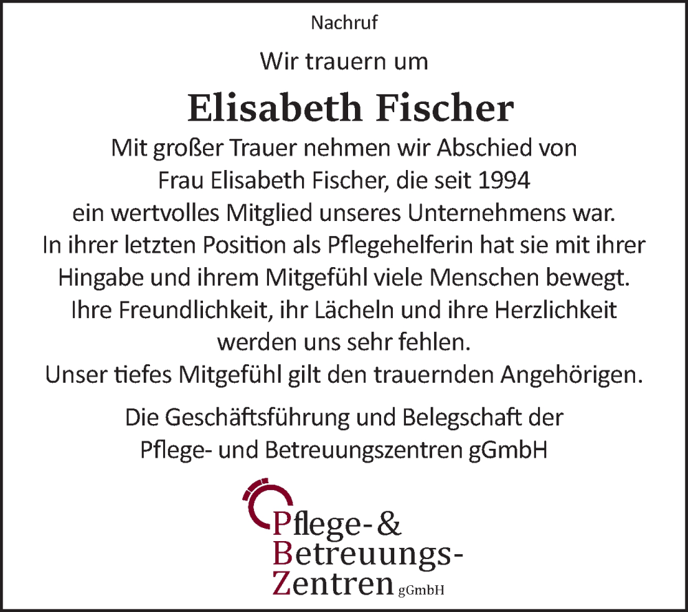 Hier finden Sie alle Traueranzeigen aus der Zeitung, die bisher für Elisabeth Fischer erschienen sind. Weitere Traueranzeigen, die in der Zeitung erscheinen, werden hier ebenfalls aufgelistet
