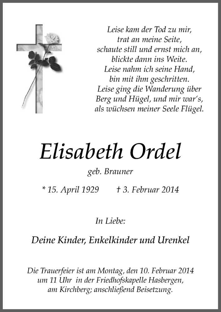Hier finden Sie alle Traueranzeigen aus der Zeitung, die bisher für Elisabeth Ordel erschienen sind. Weitere Traueranzeigen, die in der Zeitung erscheinen, werden hier ebenfalls aufgelistet