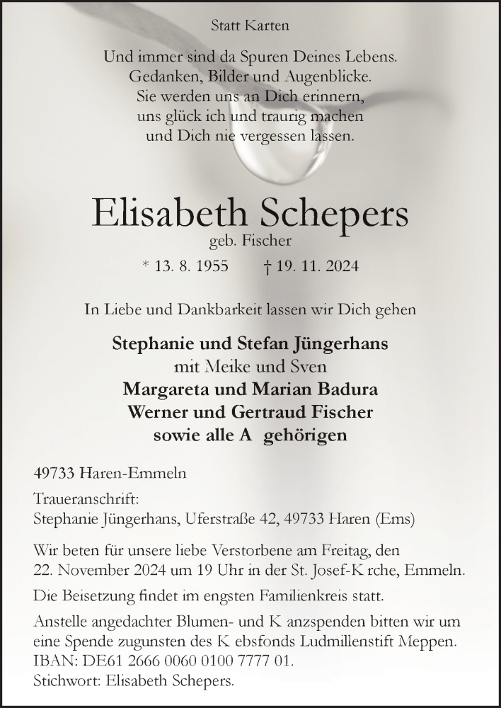 Hier finden Sie alle Traueranzeigen aus der Zeitung, die bisher für Elisabeth Schepers erschienen sind. Weitere Traueranzeigen, die in der Zeitung erscheinen, werden hier ebenfalls aufgelistet