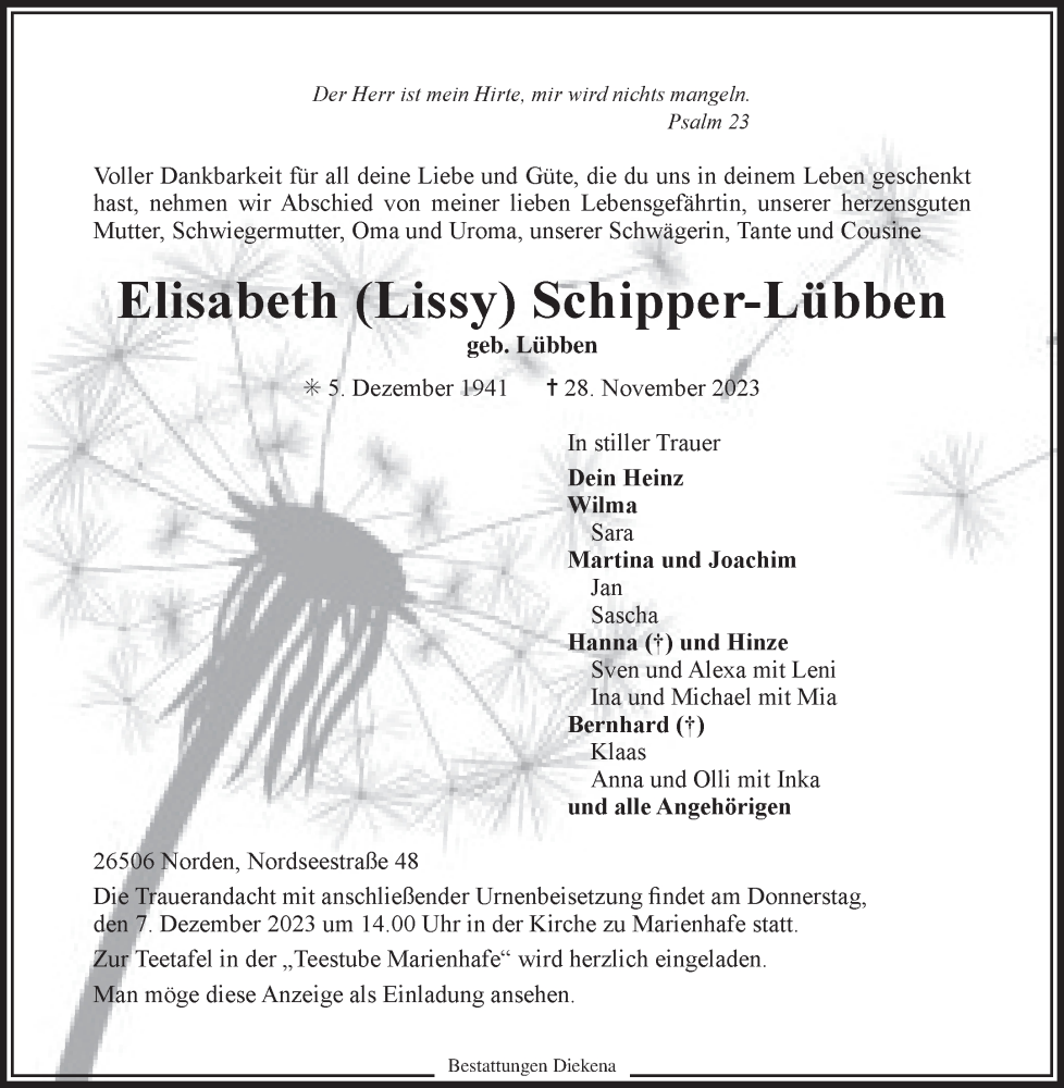 Hier finden Sie alle Traueranzeigen aus der Zeitung, die bisher für Elisabeth Schipper-Lübben erschienen sind. Weitere Traueranzeigen, die in der Zeitung erscheinen, werden hier ebenfalls aufgelistet
