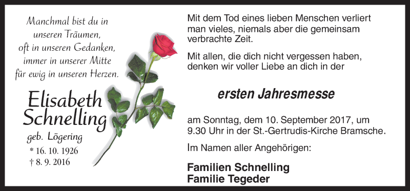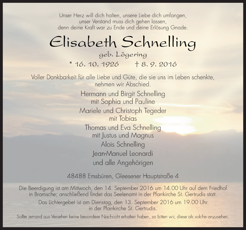 Hier finden Sie alle Traueranzeigen aus der Zeitung, die bisher für Elisabeth Schnelling erschienen sind. Weitere Traueranzeigen, die in der Zeitung erscheinen, werden hier ebenfalls aufgelistet