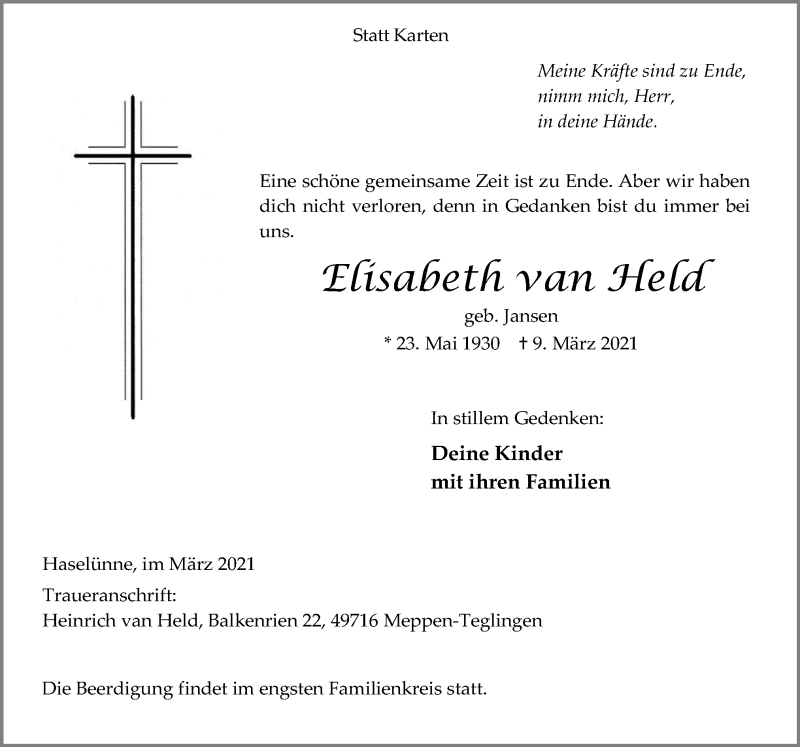 Hier finden Sie alle Traueranzeigen aus der Zeitung, die bisher für Elisabeth van Held erschienen sind. Weitere Traueranzeigen, die in der Zeitung erscheinen, werden hier ebenfalls aufgelistet