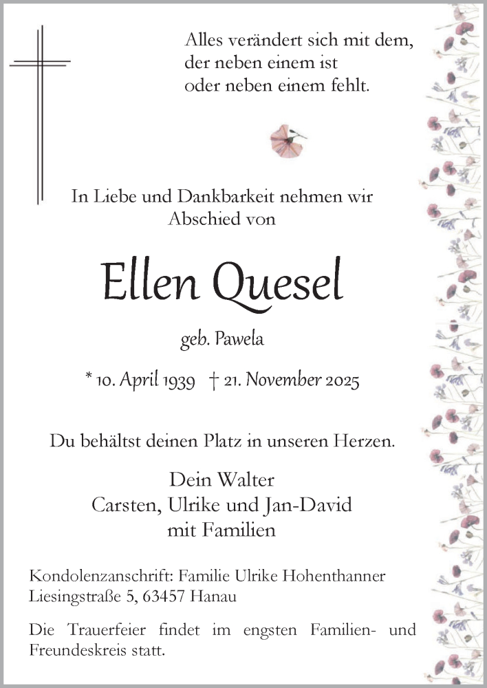 Hier finden Sie alle Traueranzeigen aus der Zeitung, die bisher für Ellen Quesel erschienen sind. Weitere Traueranzeigen, die in der Zeitung erscheinen, werden hier ebenfalls aufgelistet