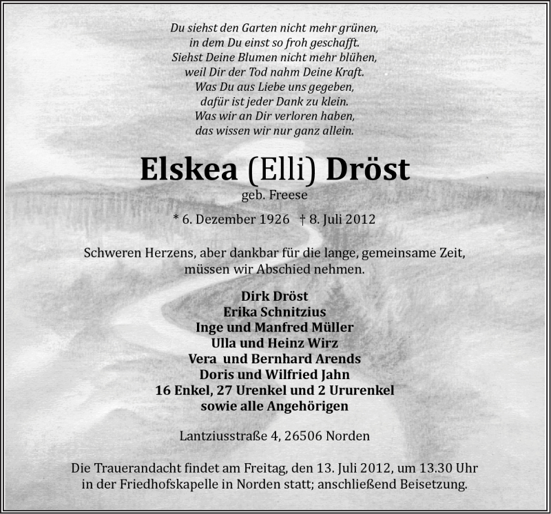 Hier finden Sie alle Traueranzeigen aus der Zeitung, die bisher für Elskea Dröst erschienen sind. Weitere Traueranzeigen, die in der Zeitung erscheinen, werden hier ebenfalls aufgelistet
