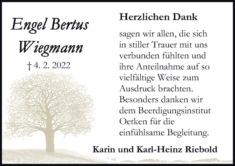 Hier finden Sie alle Traueranzeigen aus der Zeitung, die bisher für Engel Bertus Wiegmann erschienen sind. Weitere Traueranzeigen, die in der Zeitung erscheinen, werden hier ebenfalls aufgelistet