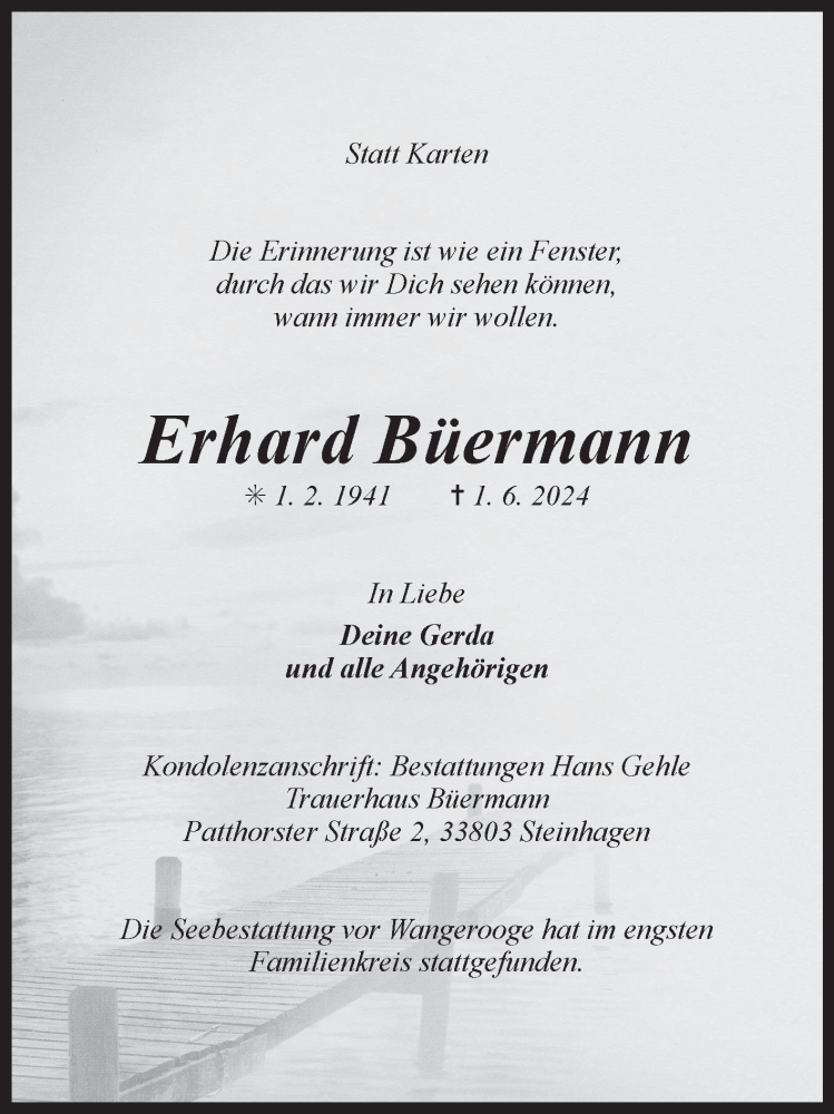 Hier finden Sie alle Traueranzeigen aus der Zeitung, die bisher für Erhard Büermann erschienen sind. Weitere Traueranzeigen, die in der Zeitung erscheinen, werden hier ebenfalls aufgelistet