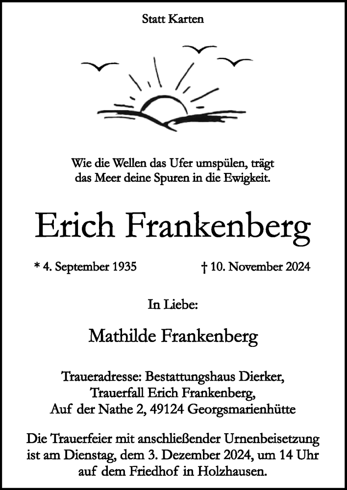 Hier finden Sie alle Traueranzeigen aus der Zeitung, die bisher für Erich Frankenberg erschienen sind. Weitere Traueranzeigen, die in der Zeitung erscheinen, werden hier ebenfalls aufgelistet
