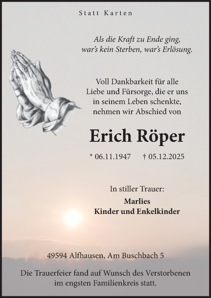 Hier finden Sie alle Traueranzeigen aus der Zeitung, die bisher für Erich Röper erschienen sind. Weitere Traueranzeigen, die in der Zeitung erscheinen, werden hier ebenfalls aufgelistet
