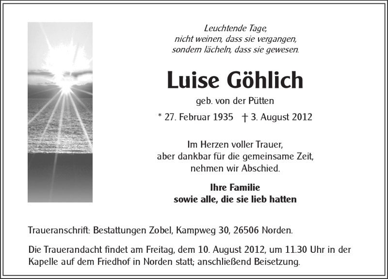 Hier finden Sie alle Traueranzeigen aus der Zeitung, die bisher für Erika Göhlich erschienen sind. Weitere Traueranzeigen, die in der Zeitung erscheinen, werden hier ebenfalls aufgelistet