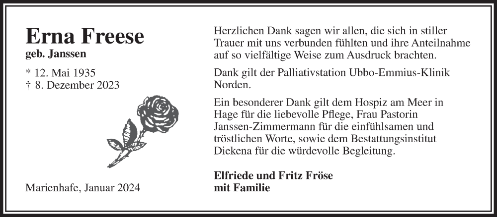 Hier finden Sie alle Traueranzeigen aus der Zeitung, die bisher für Erna Freese erschienen sind. Weitere Traueranzeigen, die in der Zeitung erscheinen, werden hier ebenfalls aufgelistet