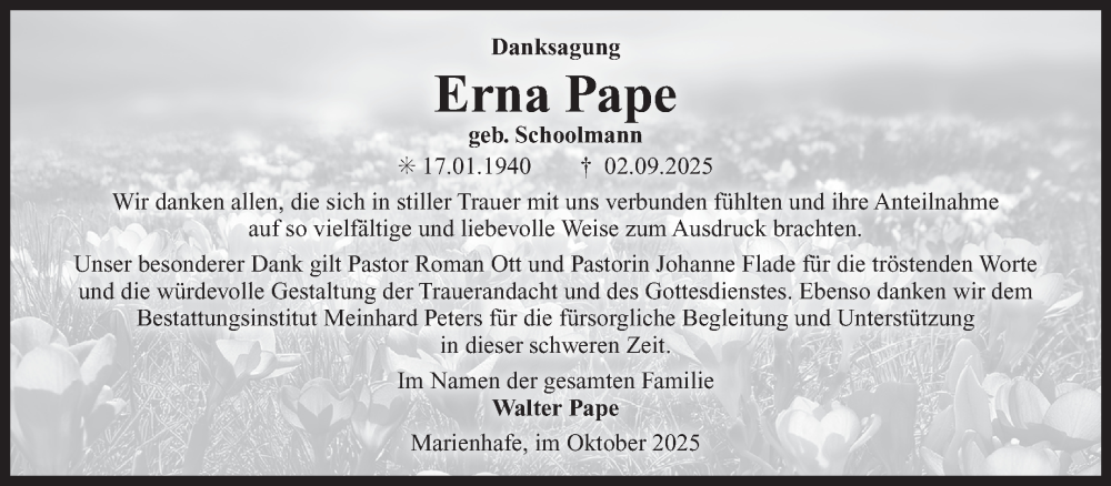 Hier finden Sie alle Traueranzeigen aus der Zeitung, die bisher für Erna Pape erschienen sind. Weitere Traueranzeigen, die in der Zeitung erscheinen, werden hier ebenfalls aufgelistet
